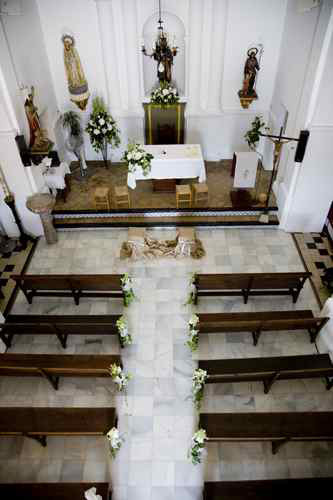 Decoraciones sencillas y clásicas para decorar las bodas en iglesias. Con pequeños toques rústicos, cestas de mimbre, cajas de madera vintage, y flores naturales que aportan un toque fresco.